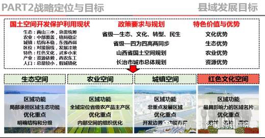 如何划定县域规划分区,是县级国土空间总体规划的重要课题。本规划认为“规划分区”是一种管理方式,这种管理方式体现对武乡国土的治理优化理念,体现对生态、农业、城镇以及特色空间的统筹部署,不应该简单的图斑对应关系。